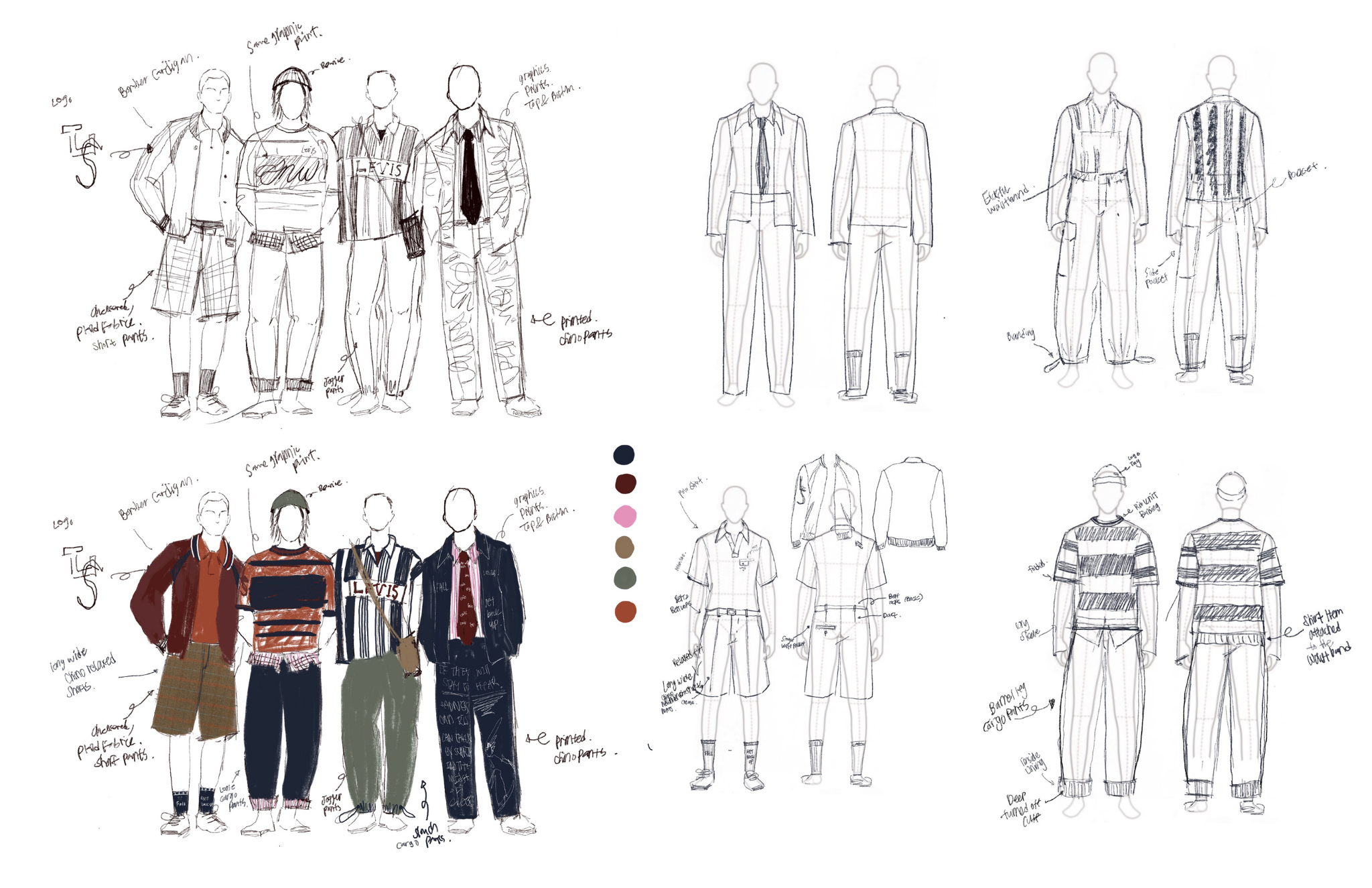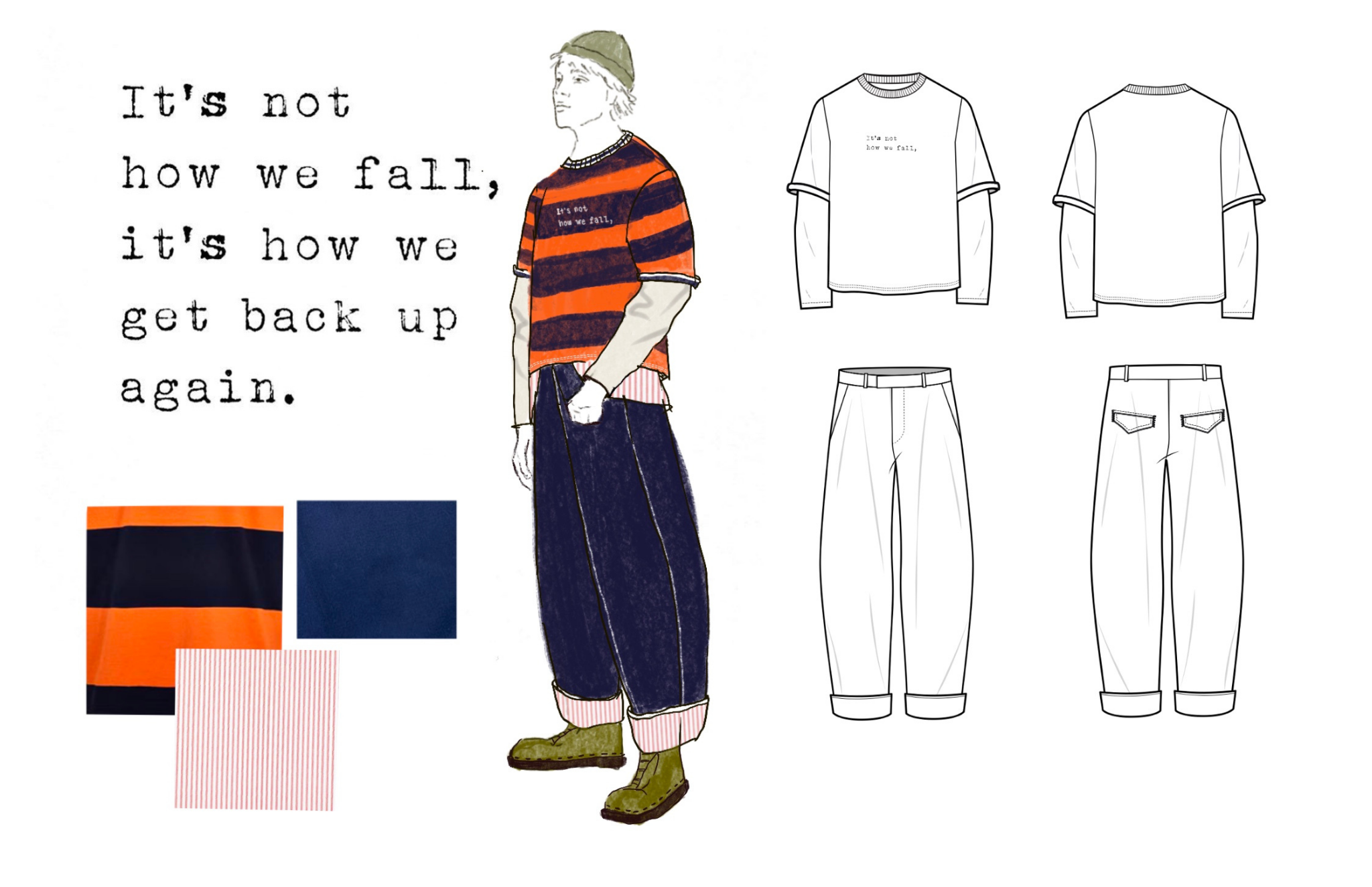 This capsule collection was created as part of Levi’s Assistant Designer interview process, where I advanced to the final round. I had one week to complete the project, which included trend research, original print design, and a focus on non-denim bottoms. Titled “Fall. Get Back Up.”, the collection explores themes of resilience through color, textile storytelling, and proportion. This project highlights my design sensibility, knowledge of fabric and fit, and ability to translate concept into brand-relevant product