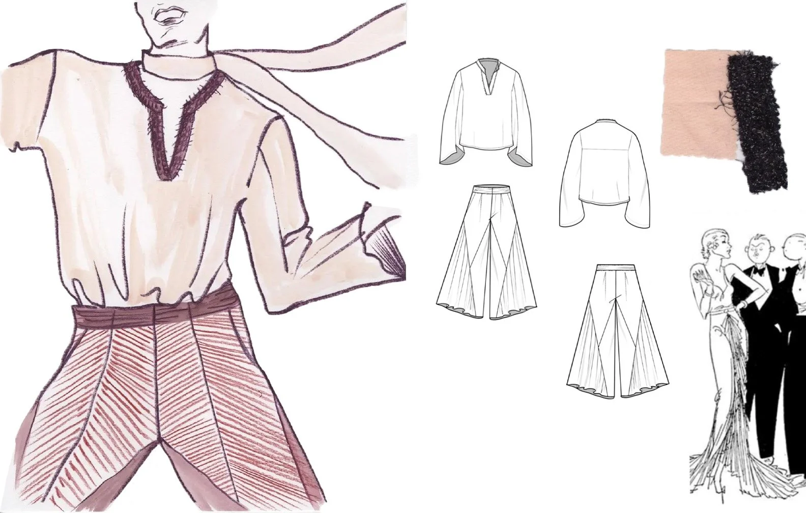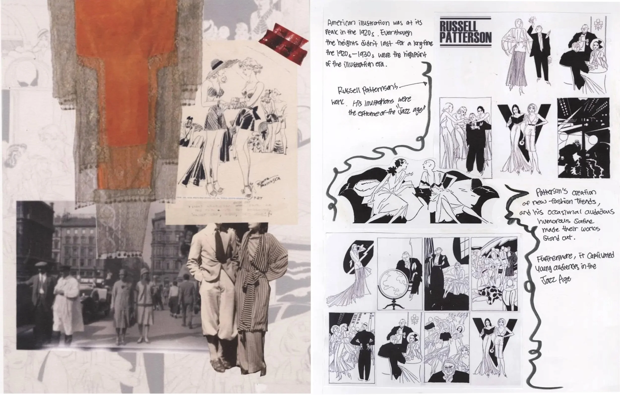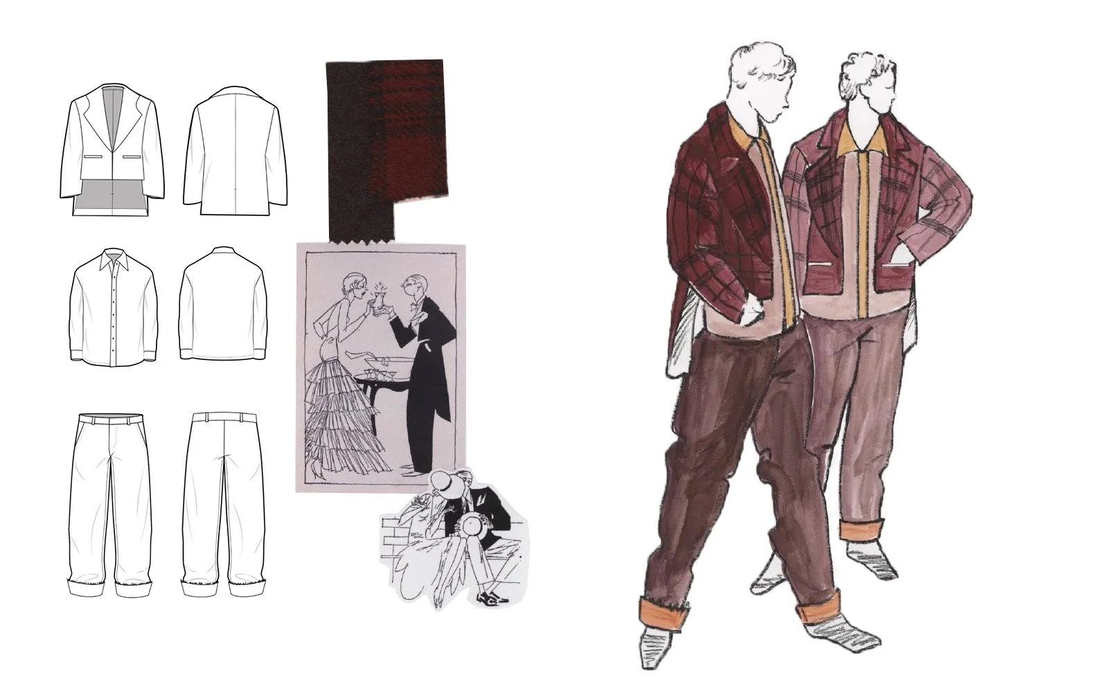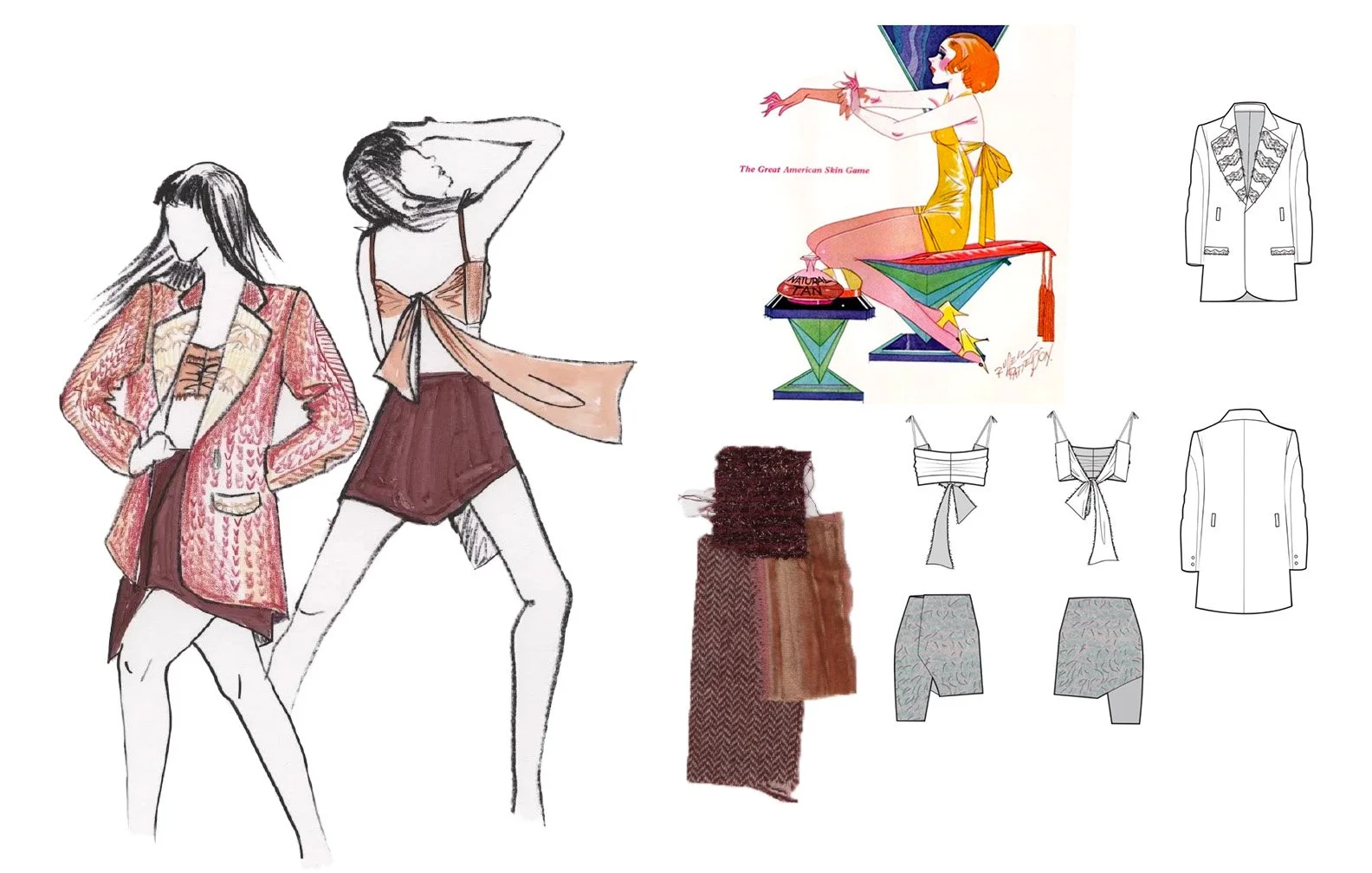 Inspired by the bold rhythm of the 1920s Jazz Age and the vivid lines of Russell Patterson’s iconic illustrations, this holiday capsule collection celebrates movement, energy, and elegance. Clean silhouettes meet the expressive brushwork and sharp line styles of Patterson’s art, echoing the pulse of a bygone era reimagined for today. Tailored pieces, fluid fabrics, and striking contrasts shape a look that’s both timeless and modern. Holiday dressing with an edge—for those who stand out and stay true.
